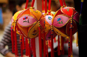 Throwing Xiuqiu (“embroidered balls”): Xiuqiu is a traditional handicraft with exquisite craftsmanship. It is a silk-woven handicraft. Each xiuqiu consists of twelve petals forming a sphere, each petal represents a certain month and is embroidered with the flowers of that month. Some xiuqiu are square or polygonal. In the past, young men and women used the xiuqiu to express their love. If a girl liked a boy, she would throw her xiuqiu to the boy. The xiuqiu has become a kind of decoration and performance prop. Women in national costumes throw the xiuqiu over their heads and then catch them when they fall.