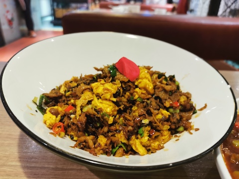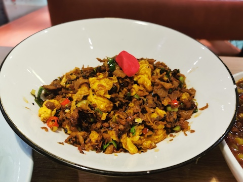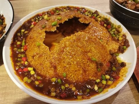 牛肉粒浇锅巴。这道菜我从未见过,当服务员把它端上来时,让我感到惊讶,哦,它很大,它就像一个锅盖。我用勺子品尝了盘子周围环绕的汤汁和蔬菜,它的味道很鲜美,没有其他的复杂的味道。然后我用筷子从“锅盖”的中心戳破它,我可以得到一块块的碎片,好吧,其实那是锅巴,锅巴是将米饭进行油炸的一道美食。锅巴蘸上旁边的汤汁,口感非常好,它是脆的,但是你不会觉得它难以咀嚼,油炸之后的锅巴的香味和鲜美的汤汁融合在一起,是的,我喜欢这道第一次品尝的菜!