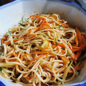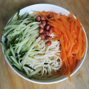 - 将面条从冷水中滤出,放入碗中。 然后将煮熟的胡萝卜、黄瓜和花生加入面条中。 最后,加入准备好的酱汁。