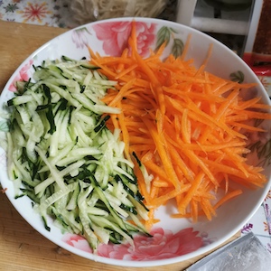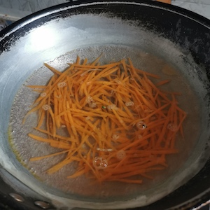 - 锅中倒入清水,烧开,放入切好的胡萝卜丝。 煮1分钟后捞出。
