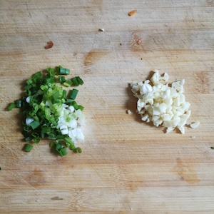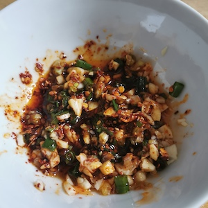 - 制作酱汁:把葱,蒜末放入碗中,加入辣椒粉,倒入加热的油,搅拌均匀。