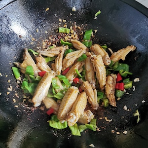 - Add the chicken wings, green peppers, and chili peppers and stir fry for 2 minutes.2 green peppers, 4 xiao mi la (millet) chili peppers, 1 pound chicken wings