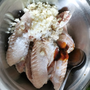 - Add the chopped garlic from step 1 to the chicken wings. Then add oyster sauce, light soy sauce, black pepper, white sugar, and salt. Stir well and marinate for 20 minutes.