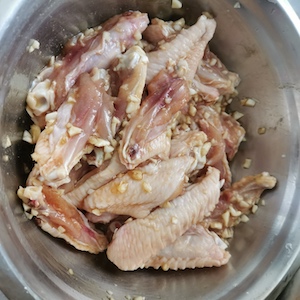 - Heat 2 teaspoons (10 ml) of oil in a wok, remove the minced garlic on the surface of the marinated chicken wings, and fry the chicken wings in the wok. Fry until golden brown, then remove the wings from the wok.