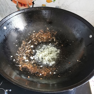 - Heat the remaining oil (10 ml) in the wok. Next, add the minced garlic and saute.
