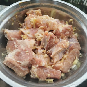 - Remove the ginger and minced garlic from the marinated pork ribs.