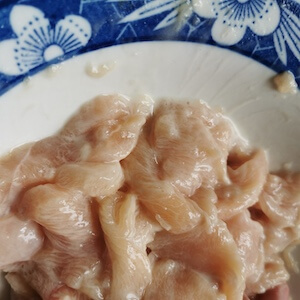 - Slice the chicken into bite-sized pieces and rinse. Pat the chicken dry, add 1/4-1/2 tsp salt, 1/2 tsp monosodium glutamate, and stir well. Add a small amount of water and stir well until the spices are absorbed by the chicken. Then add the starch and mix well. Set the chicken aside. At this point we can clearly see the texture of the chicken.1 chicken breast, 1/2 teaspoon salt, 1/2 teaspoon MSG, corn starch