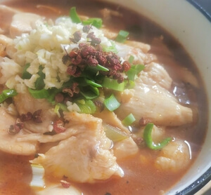 - Pour the broth and chicken into the deep dish with the other ingredients, and top with the sliced garlic, the remaining half of the dried red peppers, the Sichuan peppercorns and green onions.