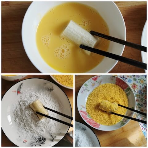 - While the oil is heating, dip the bananas in the egg, then roll in the starch for a even, thin coating. Then dip the bananas in the egg again and coat evenly with the breadcrumbs.2 bananas, 30 g starch, 40 g Panko breadcrumbs, 2 eggs
