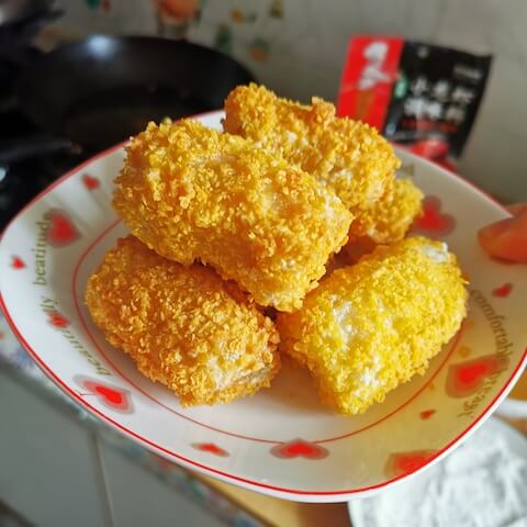 - Prepare the ingredients. Whisk the eggs until thoroughly mixed and place the starch and breadcrumbs on dry plates.2 eggs, 30 g starch, 40 g Panko breadcrumbs