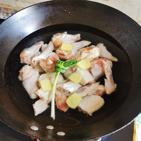 - 把鸡翅焯水。在锅中加入可以淹没鸡翅的水,把鸡翅,姜片,1根葱放入,加入5ml料酒,大火煮沸后中火煮3分钟。6 个 鸡翅, 1 根 葱, 5 ml Shaoxing wine, 5 片 姜
