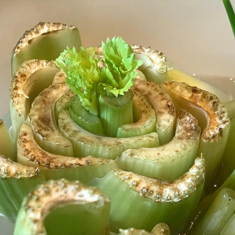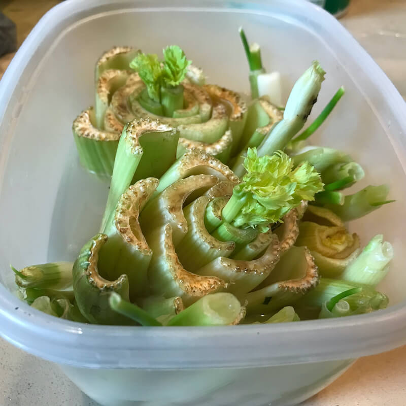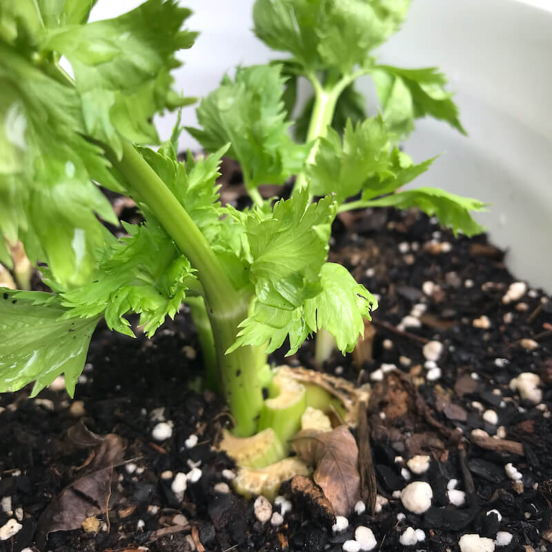- When sprouts and new roots begin to appear, it is time to transplant the celery bottoms.