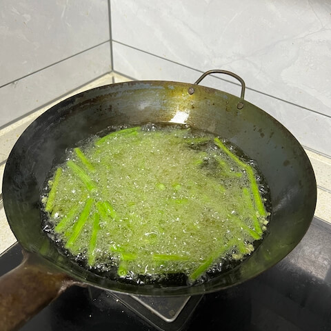 - 然后捞出,沥干油。把热油倒回储存油的容器中。