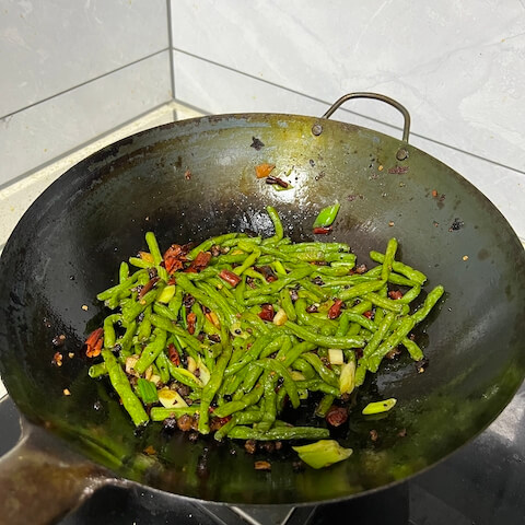 - 放入豆角和葱,加入盐。快速翻炒5秒后加入四川花椒油和辣椒油。快速翻炒均匀。400 g 豆角, 3 ml 盐, 3 ml 四川花椒油, 8 ml 辣椒油