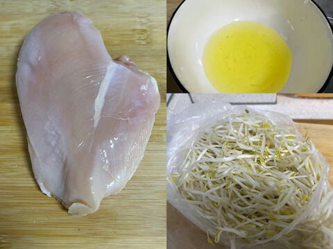 - Wash the chicken breast and bean sprouts, prepare an egg white, and stir slightly.