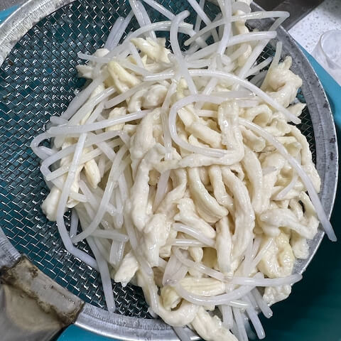 - The first step is to dry-blanch the chicken and sprouts in warm oil. This is not deep-frying. Heat a dry wok until slightly smoking and add clean (never used) oil to fill the wok to half of its capacity. Heat the oil to 90°-110°C (194°-230°F). Reduce the heat to low, add chicken shreds, and when the color changes by 1/3, use chopsticks to separate the chicken shreds. When the chicken turns completely white, turn off the heat. Then the drained bean sprouts and remove after 2 seconds. Drain the oil into a heatproof container.