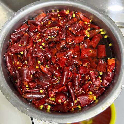 - Drain the chili peppers in a sieve, and shake to remove all the water.