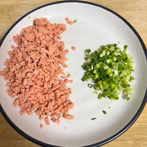 - Finely chop the ham sausage and green onion and set aside.