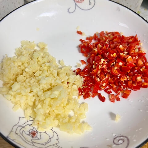 - 把蒜和小米辣切碎。