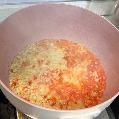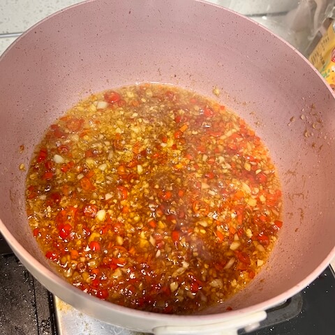 - 在锅中加入20ml油,倒入蒜和小米辣。炒出香味后进行调味(盐,生抽,老抽,蚝油)。1 个 大蒜一整, 7 个 小米辣, 20 ml 食用油, 3 ml 生抽, 2 ml 老抽, 7 ml 蚝油, 2 ml 盐
