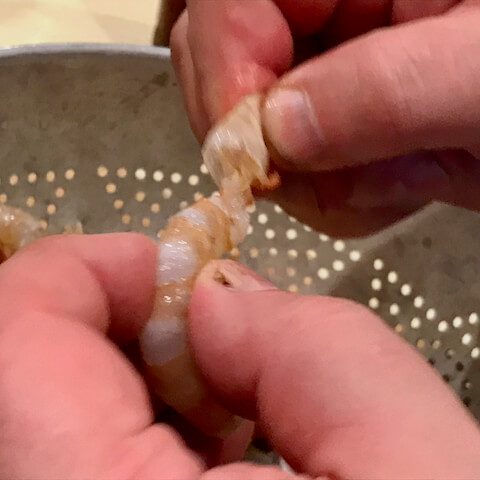This recipe calls for a pound (454 grams) of medium sized shrimp, which is about 30 shrimp in total. You can peel and devein these quickly. First, rinse all the shrimp in a sieve under cold running water. Then take each shrimp, cut off the head if still attached, then grasp the flippers below the tail and use a rotating motion up and around the body to break and twist off the shell. Then grasp the tail fin and pull the tail from the body.