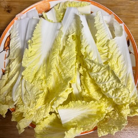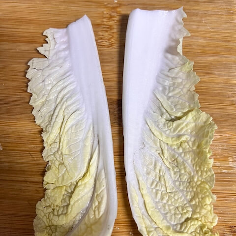 - Cut the Napa cabbage leaves in half.
