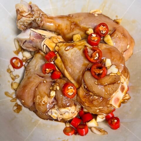 - Add light soy sauce, dark soy sauce, oyster sauce, cooking wine, white pepper, salt, minced garlic, and chili pepper to the chicken legs. Stir well. Marinate for 20 minutes.3 xiǎomǐ là chili peppers, 5 cloves garlic, 10 ml light soy sauce, 5 ml dark soy sauce, 15 ml oyster sauce, 10 ml Shaoxing cooking wine , 3 ml white pepper, 3 ml salt