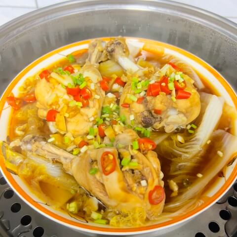 This Chinese Steamed Chicken Drumstick recipe is my own creation. Recently I have been on a diet to reduce body fat. I need a regular and healthy diet, protein, carbohydrates, dietary fiber, etc. since these are all essential to a healthy. So, I made this recipe: steamed chicken legs in a spicy and savory broth with Napa cabbage. This recipe does not use any oil. This has two advantages: it avoids the unhealthy fats in some cooking oils, and it is more economical than cooking with oil.