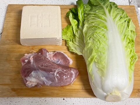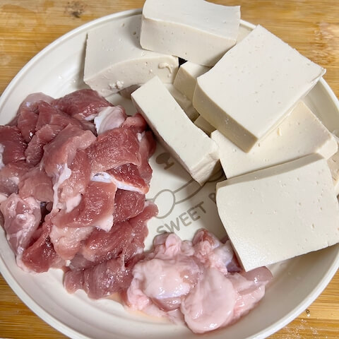 - 猪肉切片。豆腐切1.5-2cm的厚片。