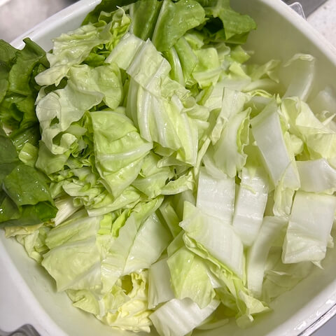 - 把白菜切碎,白色部分和叶子部分分开放。