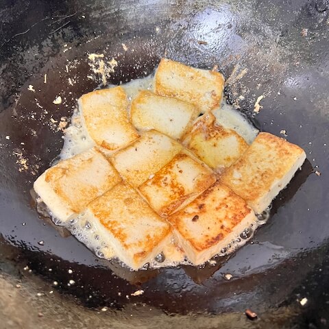 - 加热锅至轻微冒烟,倒入25ml的油,握住锅柄旋转,让热油覆盖锅内,油加热至90-100 C时,放入豆腐。煎至两面金黄后捞出,沥干油。300 g 豆腐, 40 ml 油