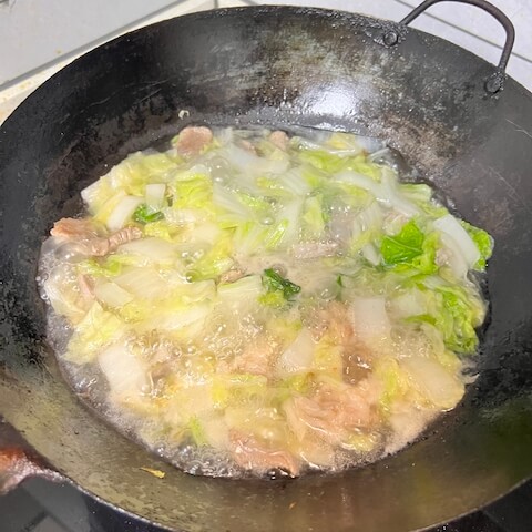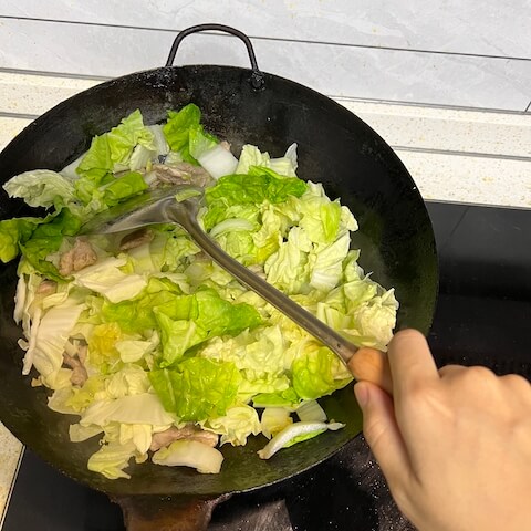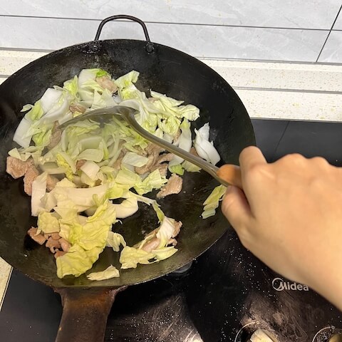 - 把白菜的白色部分和叶子部分按照先后的顺序进行烹饪,原因是白菜的白色部分比较厚,烹饪成熟的时间和叶子部分不同,所以我先炒白色部分。
