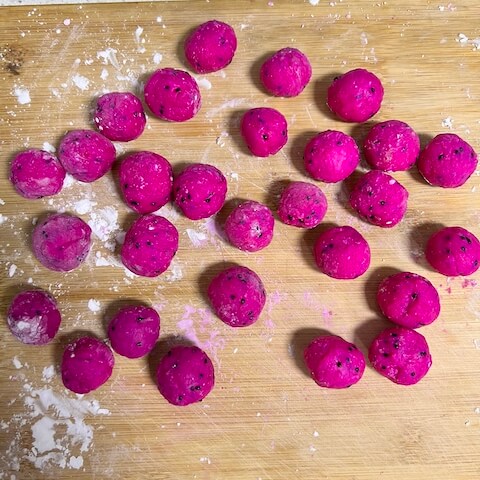 - 在用手搓火龙果面团时,小心不要被热火龙果汁烫伤手。