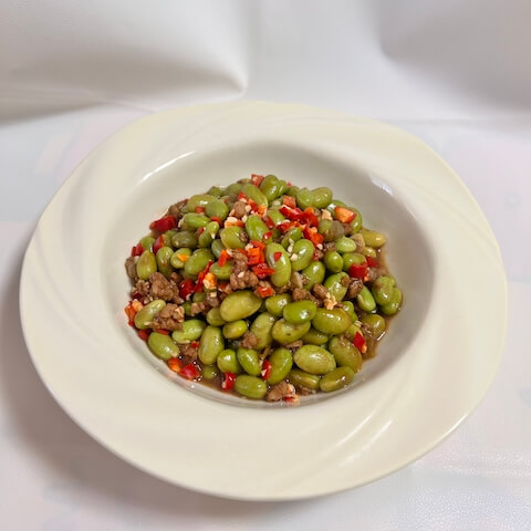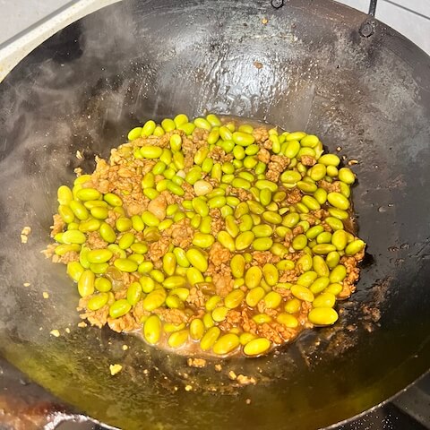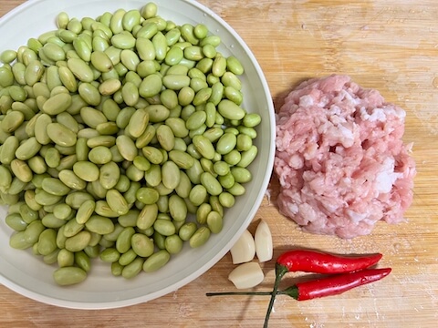 In the early days of my Chinese family kitchen, we posted a recipe for cold edamame. It was a summer snack recipe that served the edamame in the shell. For this minced pork and edamame dish, the beans must be shelled, so I bought edamame that had already been shelled to save time in preparation.