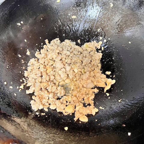 - Heat the wok over medium heat. Add 20ml (4 tsps) oil to the pan and add the minced pork. Stir-fry until it changes color, then add garlic, stir-fry until fragrant, and then add 3ml (1/2 tsp) dark soy sauce to darken the color of the minced meat.150 g minced pork, 3 cloves garlic, 20 ml oil, 3 ml dark soy sauce