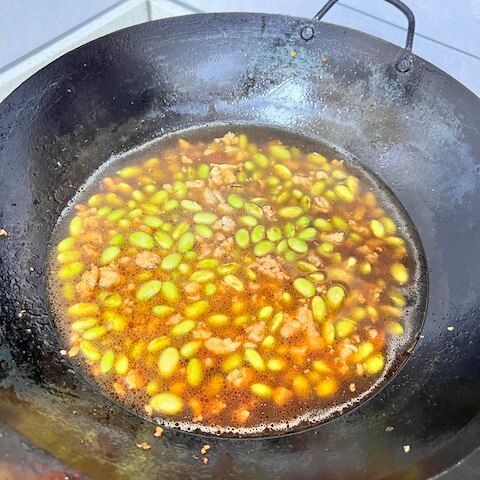 This is a two-stage recipe, first browning the pork over medium heat, then covering the pork and soybeans with water and simmering over medium-low heat until the broth is reduced. After a long cooking time, the edamame will become a little softer. In China, when we cook soybeans in a broth, we always like to cook the beans until they are soft, so, this is the texture that the beans should have after cooking.