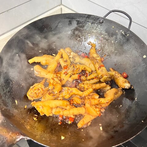 After we blanch the chicken feet, we will saute some garlic and hot, spicy xiaomila peppers to create a basic taste for browning the chicken feet. After browning, we add water to cover the chicken feet and after simmer for 30 minutes, the chicken feet will become soft and glutinous. Then they are served, and you can easily remove the bones of the chicken feet when you eat them. You will taste the chicken feet full of garlic and spicy flavor.