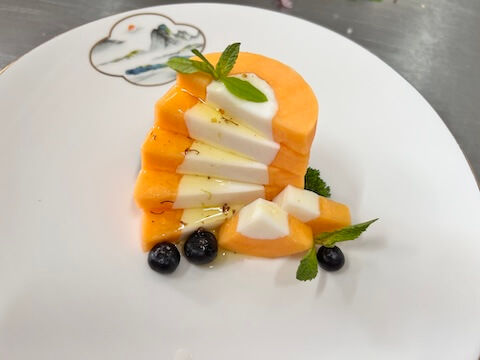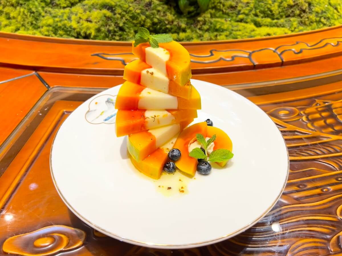 - 待吉利丁完全溶解后,将热牛奶倒入掏空的木瓜中。 然后将木瓜直立放入冰箱。