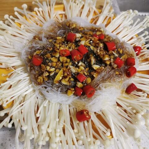 Place the fine vermicelli on the enoki mushrooms from step 1 and pour the sauce over the vermicelli.